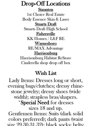 Friday FROM 4 TO 8 PM OR THE 1ST Saturday 11 to 3) to allow other people and/or families to shop for a fashion they need. Whether it be a wedding, Quinceanera, dance, dinner or pageant - we have other fashions donated that may be just perfect. Restrictions apply. This is a fundraiser, and selections require a donation. Donation amount depends on selection style and amount.