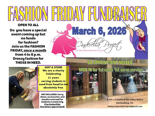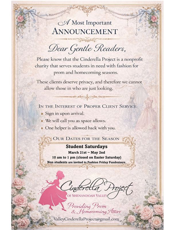 The Cinderella Project is located at 1925 E Market Street Harrisonburg, VA 22801 inside the Valley Mall. We are located across from Books A Million. We are a 501 c(3) charity that has been serving teens in need since 2004.